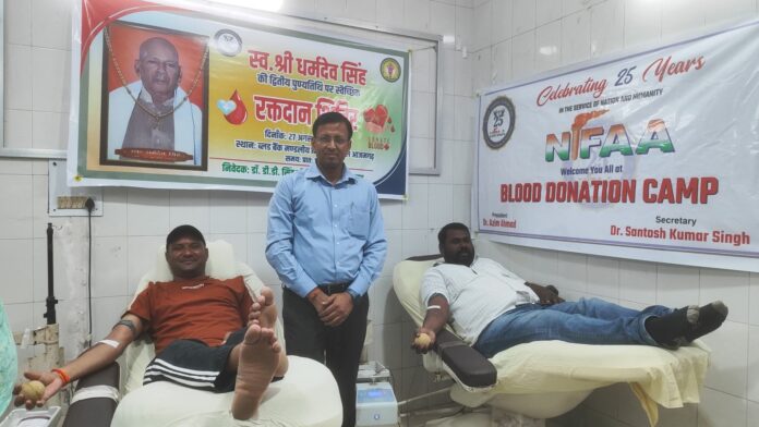 आजमगढ़ :- नेशनल इंटीग्रेटेड फोरम ऑफ आर्टिस्ट एंड एक्टिविस्ट (निफा) और नेशनल इंटीग्रेटेड मेडिकल एसोसिएशन (नीमा) आज़मगढ़ द्वारा शिक्षक स्व.श्री धर्मदेव सिंह की दूसरी पुण्यतिथि के अवसर पर बुधवार को जिला चिकित्सालय स्थित ब्लड बैंक में स्वैच्छिक रक्तदान शिविर का आयोजन किया गया। शिविर में 45 लोगों ने रक्तदान किया। सर्वप्रथम उपस्थित सभी लोगों ने स्व.श्री धर्मदेव सिंह के चित्र पर माल्यार्पण किया तथा पुष्पांजलि अर्पित की। तत्पश्चात रक्तदान शिविर का शुभारंभ मण्डलीय जिला चिकित्सालय के प्रमुख अधीक्षक डॉ. ओ.पी. सिंह और श्री रामानंद सरस्वती पुस्तकालय जोकहरा की निदेशिका हिना देसाई ने संयुक्त रूप से फीता काटकर किया।