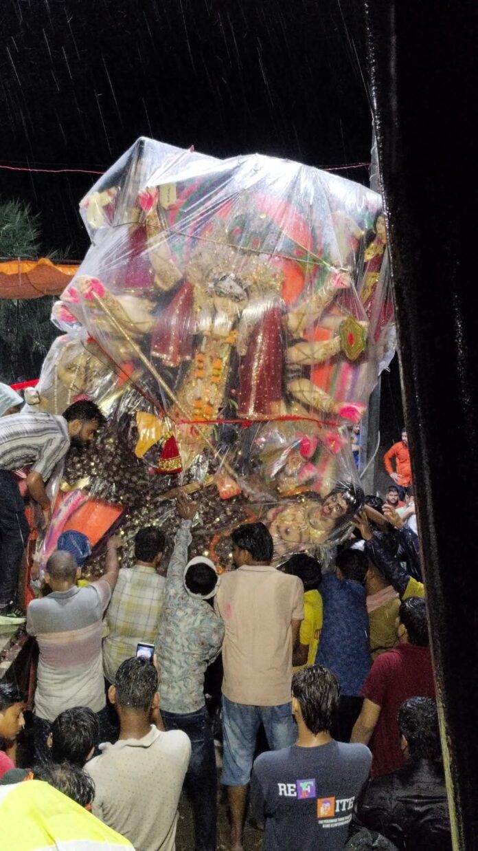 परन्तु वहीं नगर में हो रही भारी बारिश के कारण मूर्ति आयोजकों द्वारा बारिश कम होने के बाद ही मूर्ति लाने का विचार करने लगे । लेकिन रात नगर में बारिश जो शाम को शुरू हुआ पूरी रात्रि तक जोरशोर से होने लगा । इसी बीच मूर्ति आयोजकों ने भी भारी बारिश में ही विसर्जन करने फैसला कर नगर में पहली बार भारी बारिश के बीच बड़े उत्साह के साथ माता की प्रतिमा का विसर्जन नगर में परंपरागत तरीके से किया जाने लगा।